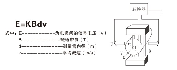 電磁流量計測量原理是基于法拉第電磁感應定律。流量計的測量管是一種內襯絕緣材料的非導磁合金短管。兩只電極沿管徑方向穿通管壁固定在測量管上。其電極頭與襯里內表面基本齊平。勵磁線圈為雙向方波脈沖勵磁時,將與測量管軸線垂直的方向上產生一磁通量密度為B的工作磁場。此時,如果具有一定電導率的流體流經測量管。將切割磁力線感應出電動勢E。電動勢E正比于磁通量密度B,測量管內徑d與平均流速v的乘積。電動勢E(流量信號)由電極檢出并通過電纜送至轉換器。轉換器將流量信號放大處理后,可顯示流體流量,并能輸出脈沖,模擬電流等信號,用于流量的控制和調節。