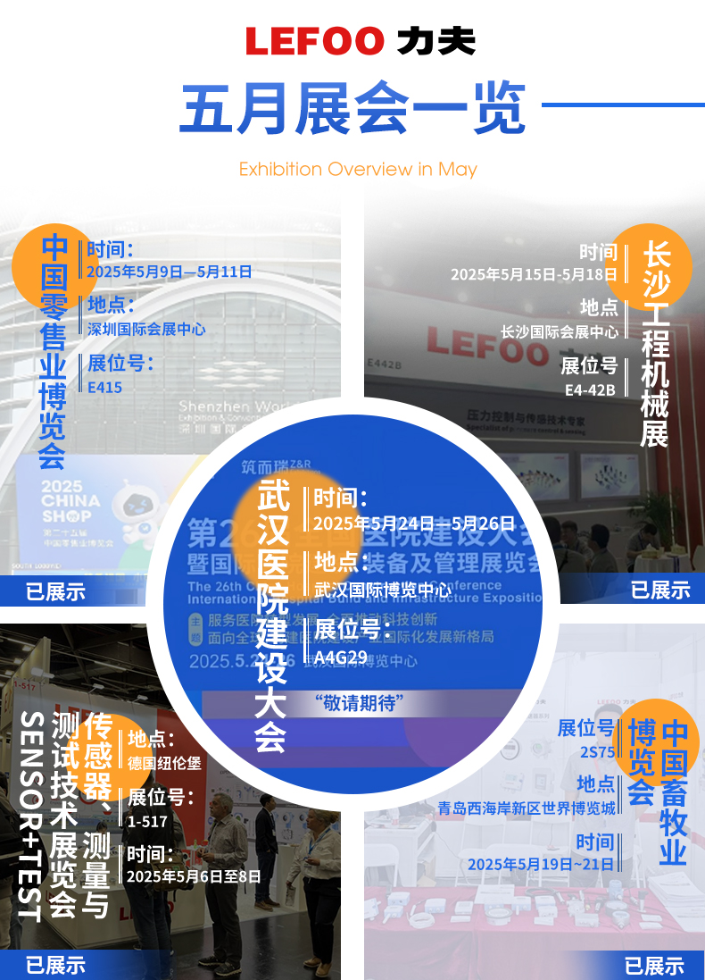從德國紐倫堡傳感器、測量與測試技術展覽會(5.6-8,展位1-517)到深圳零售博覽會(5.9-11,E415)的智能零售解決方案展示;從長沙工程機械展(5.15-18,E4-42B)的工業傳感技術交流,到青島畜牧展(5.19-21,2S75)的智慧農業應用落地;最終聚焦武漢醫院建設大會(5.24-26,A4G29),力夫與您相約武漢醫院建設大會,共筑行業新生態!