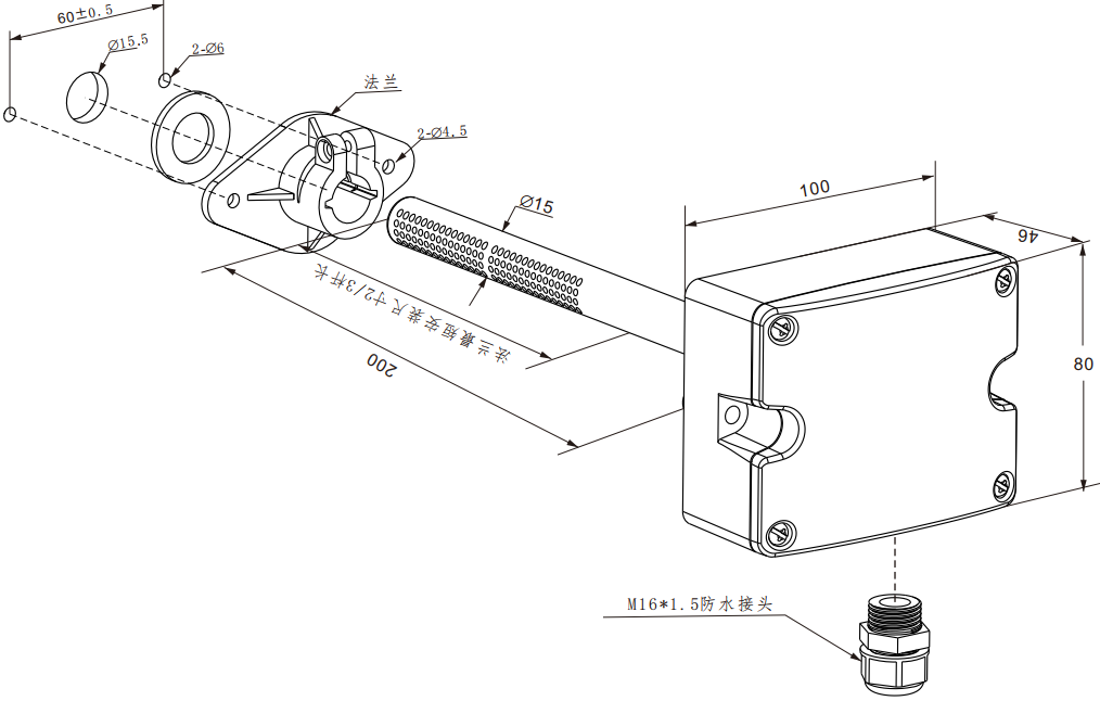 如圖使用法蘭固定安裝方式:在管道上鉆一個直徑為15.5mm的通孔,首先將密封墊和法蘭固定在風道上,再將探桿插入到風道中(法蘭安裝位置最短要≥2/3桿長),鎖緊法蘭螺釘使其抱緊探桿。安裝尺寸如圖所示