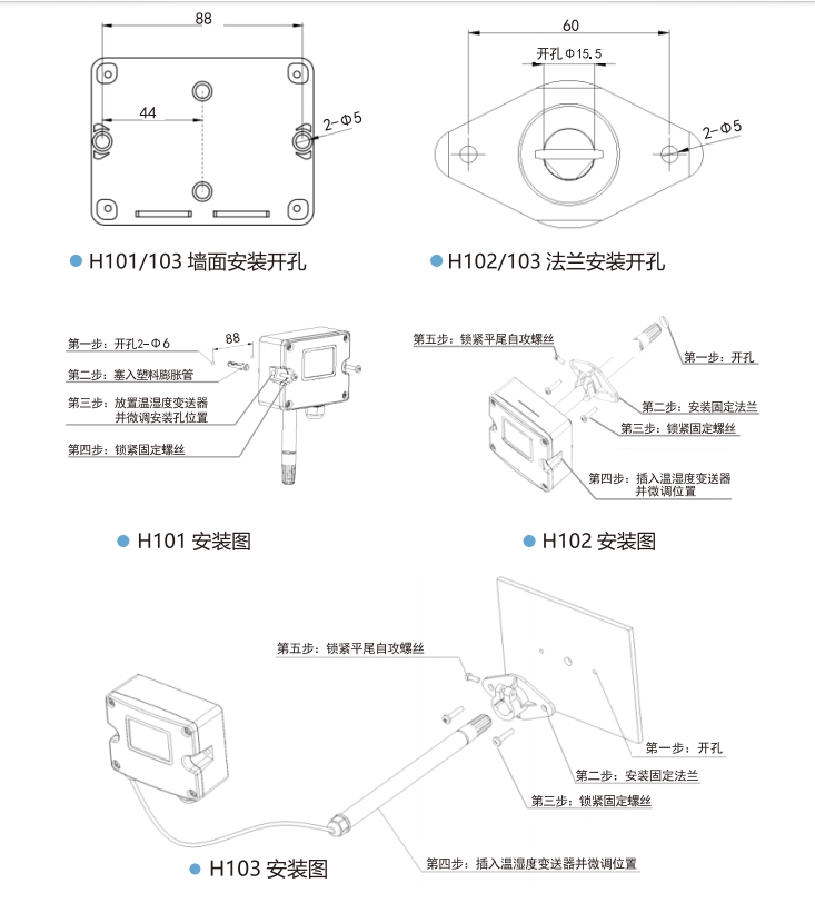 2.H101/103掛墻安裝時應垂直,并注意探頭朝下。安裝位置應遠離影響測量的因素,如冷、熱源等,并應避免陽光直射或雨淋,必要時應另行安裝遮陽板或防雨罩。在安裝平面處按照安裝圖的開孔尺寸(見上圖)開2個固定孔,再用2顆螺絲固定底盒。H103探頭管安裝描述與H102使用法蘭安裝相同。