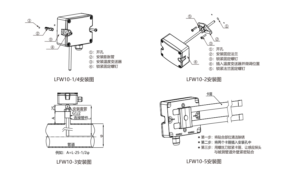 3、LFW105卡箍型的精度與管壁材質、安裝、環境溫度、風速等相關,難以達到上述精度。